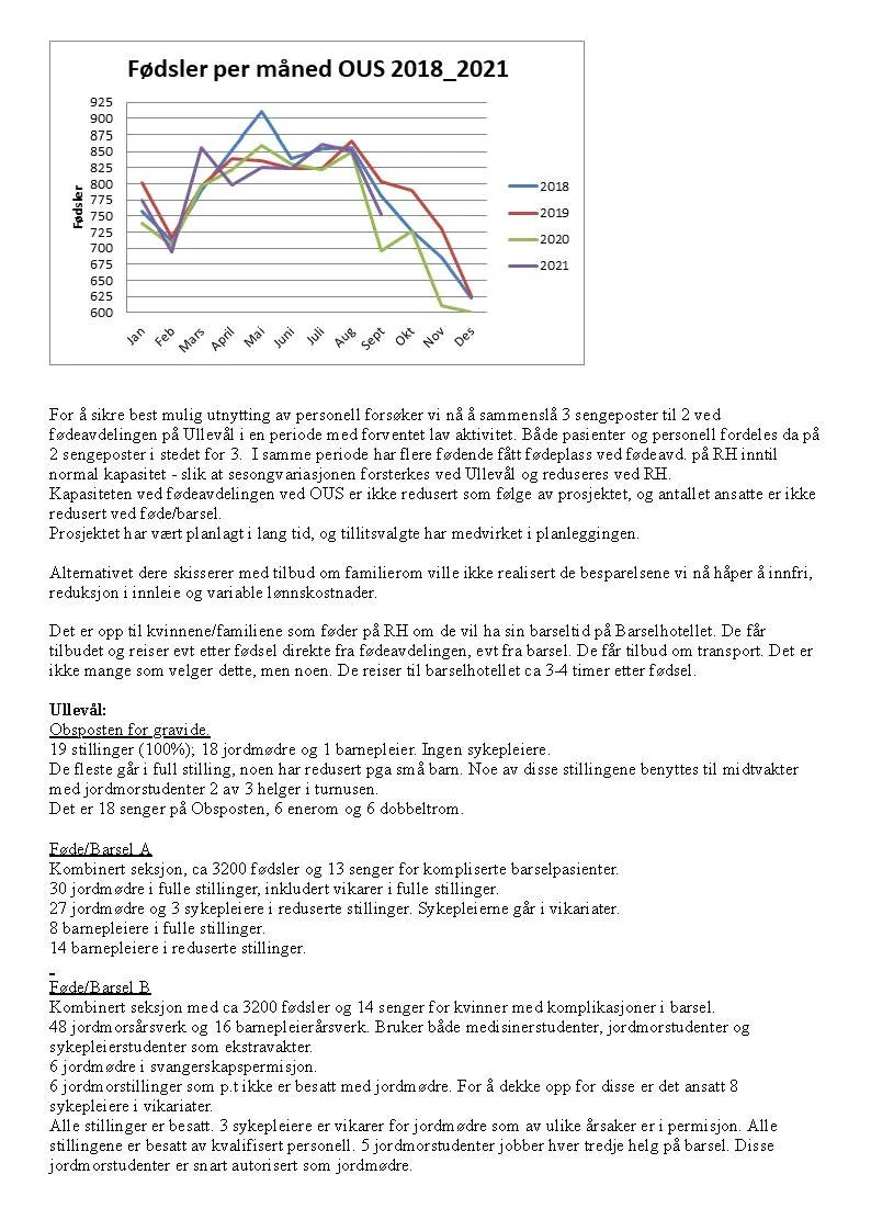 Kapasiteten ved fødeavdelingen ved OUS er ikke redusert som følge av prosjektet, og antallet ansatte er ikke redusert ved føde/barsel.
