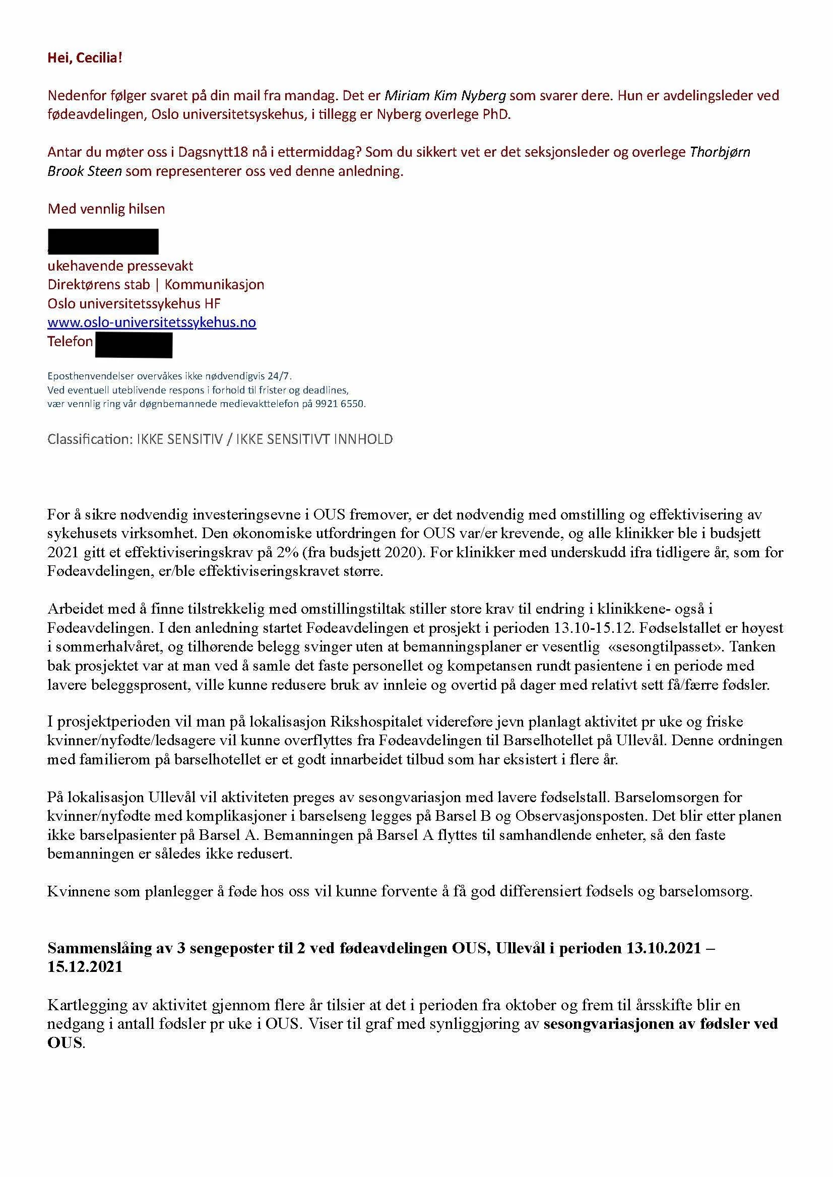(Svarene er skrevet av avdelingsleder ved fødeavdelingen, Oslo universitetssykehus, Miriam Kim Nyberg, og videreformidlet til oss via ukehavende pressevakt, Direktørens stab, OUS. Svarene er som følger:)