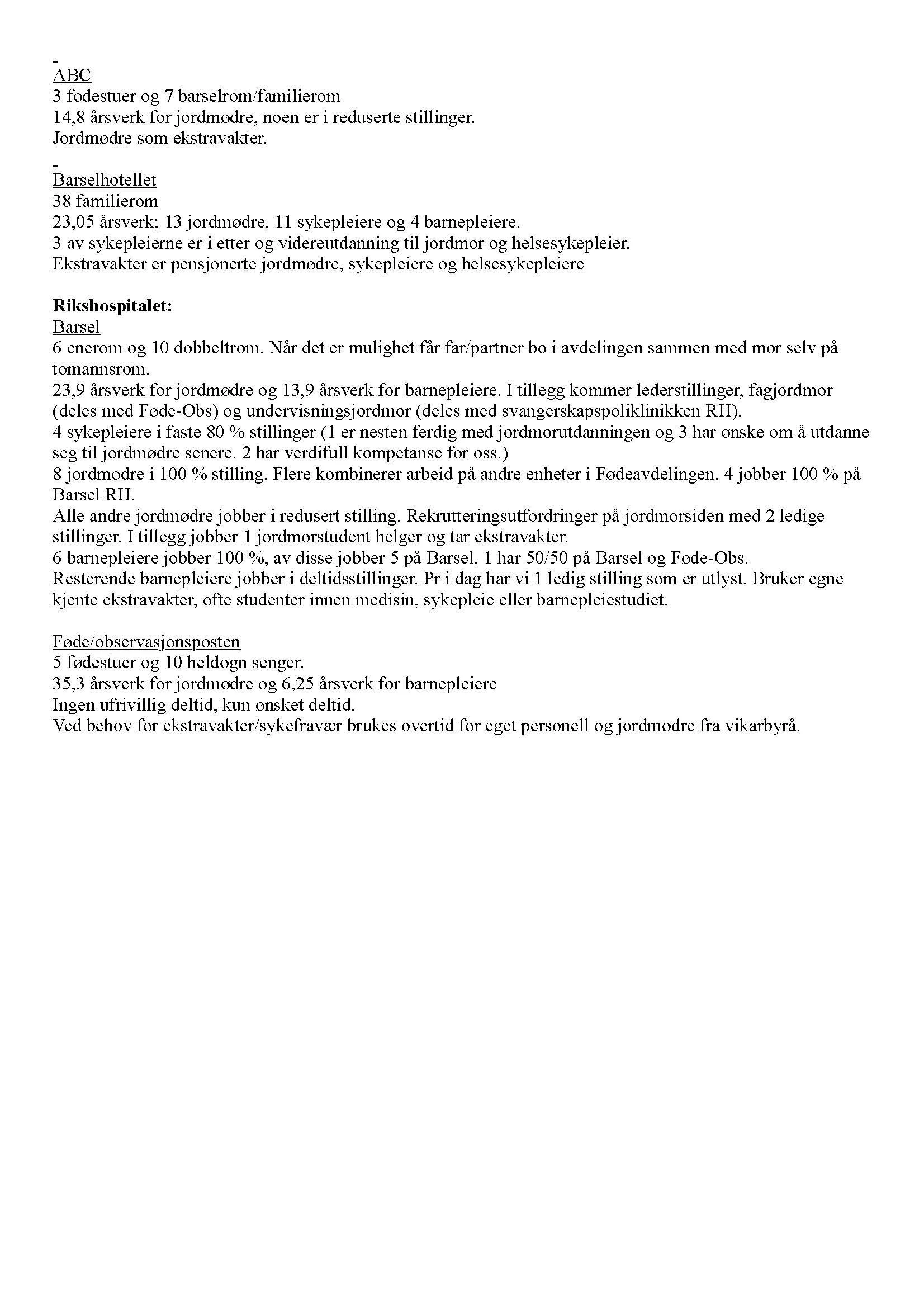 Bemanningen på barselavdelingene og Barselhotellet. Vi stilte spørsmål om bemanningen på de ulike avdelingene. Vi ville gjerne vite om stillingene var besatt av jordmødre og barnepleiere, og om de som ønsket det hadde fått tilbud om fulle stillinger. Vi fikk utfyllende svar på dette spørsmålet. Her kan vi trekke frem at på Barsel B er det seks jordmorstillinger som per dags dato ikke er besatt med jordmødre. Det kom også frem at det er rekrutteringsproblemer på barsel på Rikshospitalet med to ledige stillinger. I tillegg vil vi trekke frem at mange av de ansatte på Barselhotellet hverken er jordmødre eller barnepleiere.