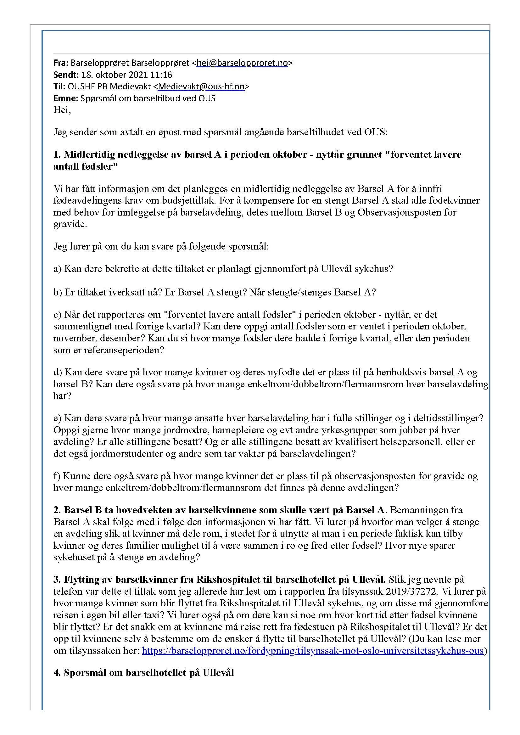 Vi sendte følgelig en e-post til pressevakten med alle våre spørsmål angående stengingen av Barsel A, og noen mer generelle spørsmål om barseltilbudet. Som svar på våre spørsmål fikk vi tilbud om et møte med avdelingen. Dette valgte vi å avslå, og heller be om skriftlige svar på våre spørsmål. Vi ønsket oss skriftlige svar fordi dette vil være informasjon vi kan dele og gjøre tilgjengelige for alle interesserte. Vi mener at denne informasjonen burde være offentlig tilgjengelig.