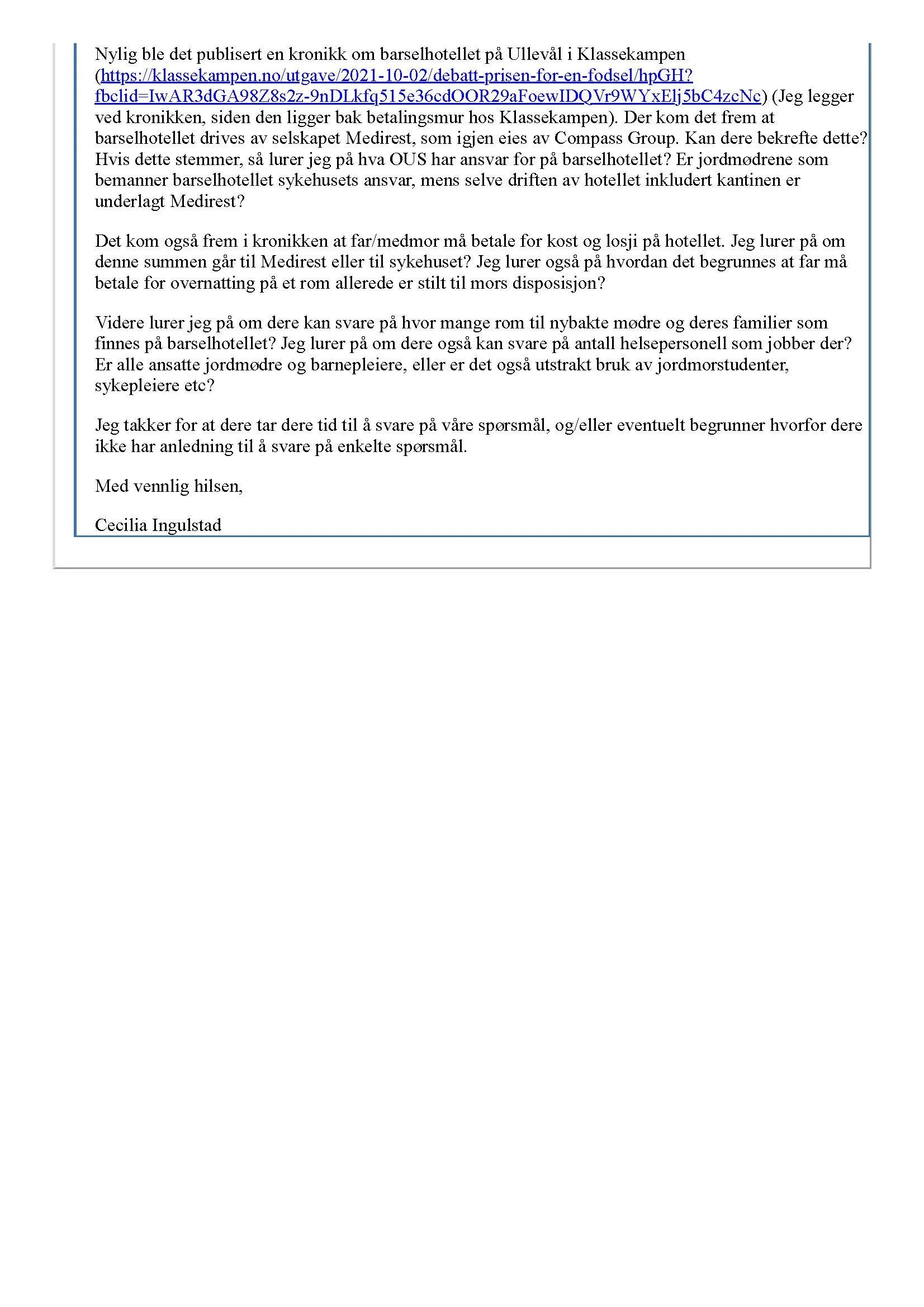 Nylig ble det publisert en kronikk om barselhotellet på Ullevål i Klassekampen (https://klassekampen.no/utgave/2021-10-02/debatt-prisen-for-en-fodsel/hpGH?fbclid=IwAR3dGA98Z8s2z-9nDLkfq515e36cdOOR29aFoewIDQVr9WYxElj5bC4zcNc) (Jeg legger ved kronikken, siden den ligger bak betalingsmur hos Klassekampen). Der kom det frem at barselhotellet drives av selskapet Medirest, som igjen eies av Compass Group. Kan dere bekrefte dette? Hvis dette stemmer, så lurer jeg på hva OUS har ansvar for på barselhotellet? Er jordmødrene som bemanner barselhotellet sykehusets ansvar, mens selve driften av hotellet inkludert kantinen er underlagt Medirest?